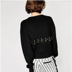 This black jumper is made from soft, comfortable cotton. It is adorned with openwork details and silver-toned piercing-style jewelled details on the sleeves and body which guarantee an on-trend rock 'n' roll touch. Team it with jeans and trainers for a casual look with a rebellious vibe.