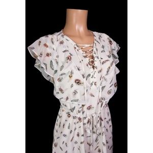 Stylish mini dress with feather pattern. Lace-up front detail. Ruffled sleeves for a feminine touch.