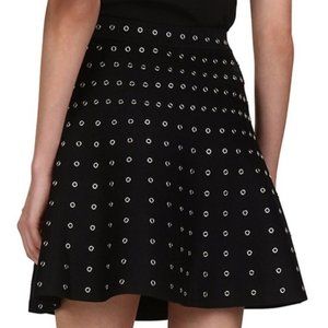 Slightly structured mini skirt in a black stretch knit. Banded waist, pull on, adorned with all-over silver grommets.