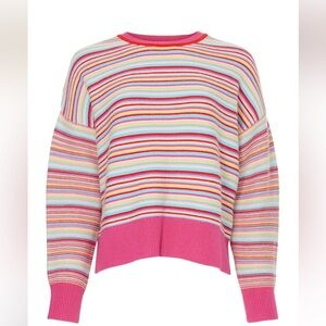 Bright and playful, this Stripe Drop Shoulder Sweater by The Kooples is a relaxed, casual-chic essential for effortless everyday style. Featuring vibrant horizontal stripes in multiple colors, a classic crew neckline, and dropped shoulder seams for a laid-back, slouchy fit. Designed with ribbed cuffs and hem, long sleeves, and a slightly cropped silhouette. Measures approximately 20.5” from shoulder to hemline.