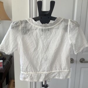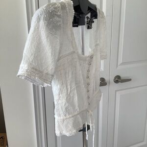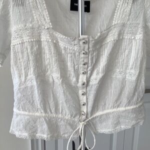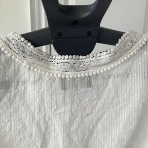So pretty, light, summery and feminine. Beautifully detailed with lace and lace inserts on Swiss dot fabric, a tie feature at lower part of top snd fabric covered buttons with metal detail.
