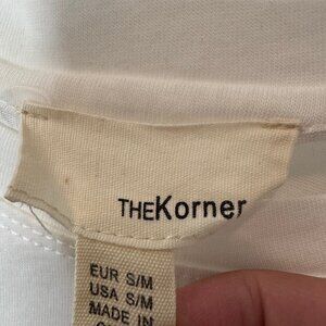 A white floral graphic tee, from the brand "The Korner". This style features a charming and vibrant floral print in shades of lavender, yellow, and red against a crisp white background. The design has a slightly retro or bohemian aesthetic, evoking a relaxed and summery vibe. A comfortable, loose-fit t-shirt, perfect for casual wear.