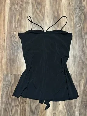 Sleek black camisole with ruched front and thin spaghetti straps. Soft draped bodice flows into cascading ruffle detail down the center. Feminine and versatile for evening or casual wear.