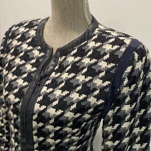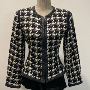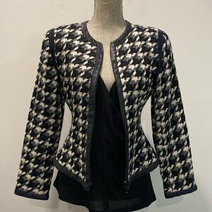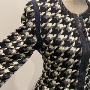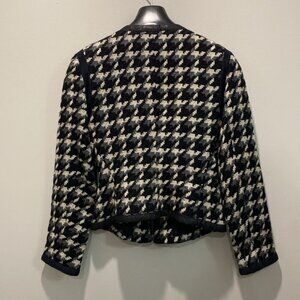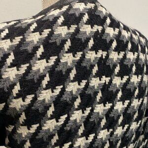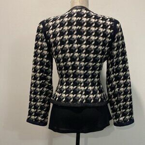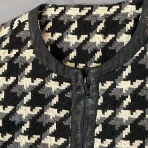 This is a black and white houndstooth patterned women's jacket. It is a fitted style with a zipper closure and long sleeves. The jacket is made of a woven fabric and has a smooth lining. The jacket is in great condition with no visible signs of wear or damage. The jacket is approximately 22 inches long and has a 17.5 inch bust. The jacket is a fitted size small and is made by the brand "The Limited". The jacket is a classic style that can be dressed up or down.