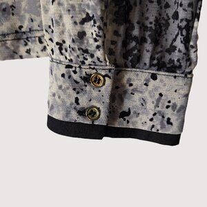Long-sleeved blouse from The Limited, featuring a black and white speckled pattern with a black trim around the neckline and cuffs.. The pattern is concentrated in the center of the blouse, fading out towards the edges. It has a small V-neck opening at the front. The sleeves are long and slightly gathered at the cuffs. The overall style of the blouse is a casual yet sophisticated look, suitable for various occasions