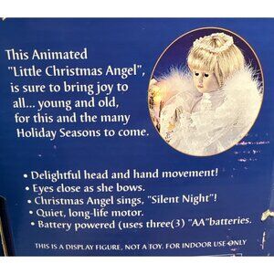 This charming animated doll is dressed in a delicate lace outfit, complete with wings and halo. It sings "Silent Night" while moving its hands and closing its eyes. Ideal for adding a touch of elegance to holiday decor. Batteries required for operation, not included.