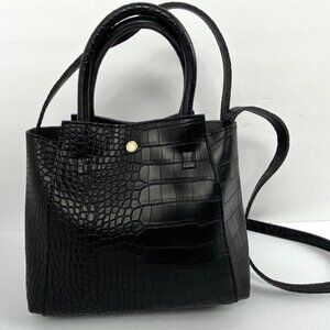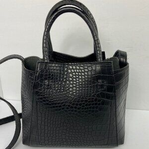 The Lovely Tote Black Faux Leather Shoulder Bag. Has a top handle as well. Inner card slots and zippered pocket. Looks like snake print on the outside. Shell is 100% polyvinyl chloride and trim is poly. Excellent pre-loved condition. No visible flaws.