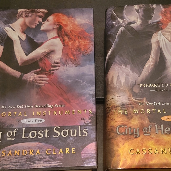 Set of two books from The Mortal Instruments series. Features vibrant cover art with red and black tones.