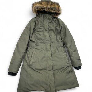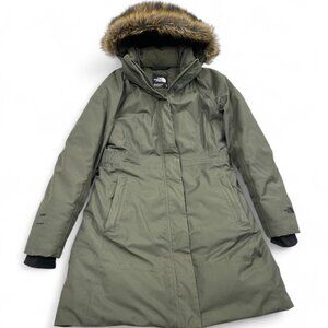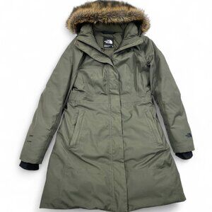 The North Face 550 Goose Down Parka Faux Fur Olive Green Removable Hood Womens M