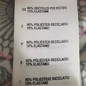 Features: pull on, slight v neck, cap sleeve, panel at waist in solid color, circle print pattern, curved hem, vaporwick, recycled polyester, elastane, activewear, athleisure, hiking