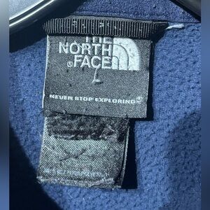 Men's zip-up sweater by The North Face. Dark blue with white logo. Cozy and versatile.