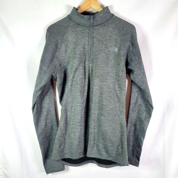 North Face stylish heathered gray pullover with a quarter-zip turtkeneck design. Perfect for winter layering. Fleece lining. Shaped to form, and long sleeves. GUC, only real sign of wear is some mild piling under arms. Lots of stretch in this fabric. Flash-Dry material