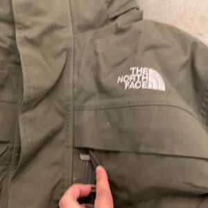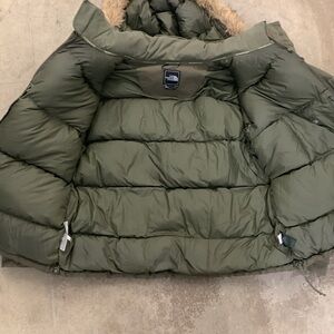 Experience ultimate warmth and style with The North Face Green Puffer Jacket. This hip-length coat features a quilted design and a high collar, ensuring you stay cozy in cold weather. Crafted from durable, weather-resistant fabric, it's perfect for outdoor adventures.