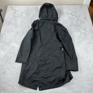 The North Face Hyvent Black Windbreaker Women's Size Large Windproof Waterproof in good pre owned condition as shown in the photos with no flaws. Just hard to get the belt into the right hand side of the jacket as shown in the third photo.
