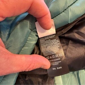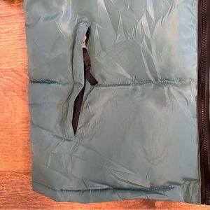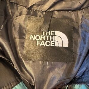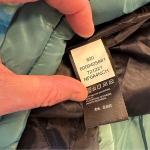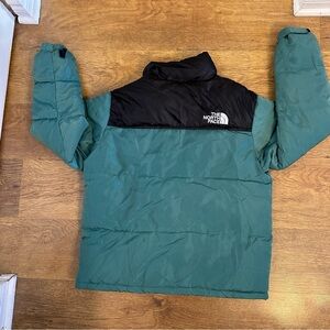 Stylish puffer jacket by The North Face. Features a green body with black accents. Warm and comfortable design.