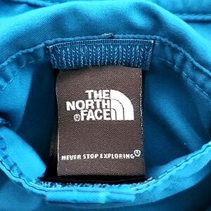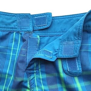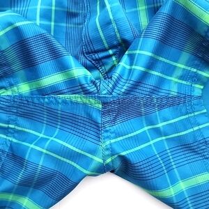 Excellent pre-owned condition, The North Face Never Stop Exploring women's reversible shorts with one side in a blue and green plaid and other in solid blue, size 12.