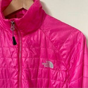 The North Face Pink Puffer Jacket Packable Outdoors Size Medium. Nylon exterior, flash dry technology. Zip up hooded jacket. Super lightweight, great for transition weather. Size medium. Good condition, has a couple spots shown in the last photo.