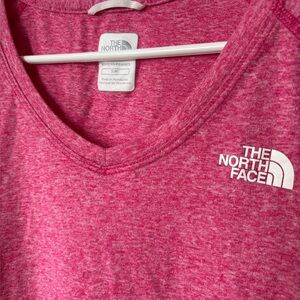 Lightweight pink performance tee by The North Face with short sleeves and a flattering V-neck. Ideal for workouts or layering. PTP: 18in | Length: 23in. Condition: 8/10 (see photos, slight wear).