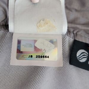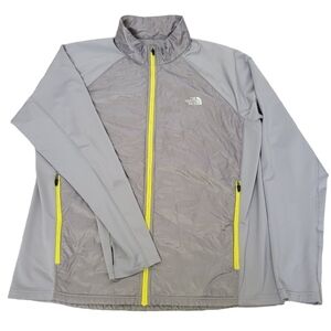 This jacket is in grey with silver branding and bright green details. some thread on the right underarm is loose, but there is no hole as shown. price reflects.
