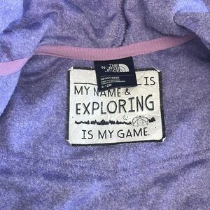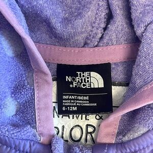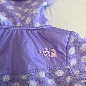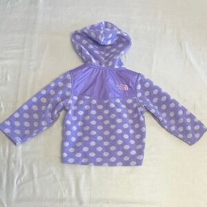 Adorable purple baby hoodie by The North Face. Features playful polka dots and a snug hood. Perfect for cozy outings.