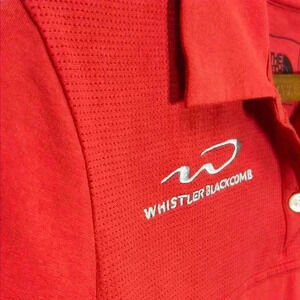 A vibrant red polo shirt with a classic polo-style collar and short sleeves, a fitted and buttoned design, and a Whistler Blackcomb logo.