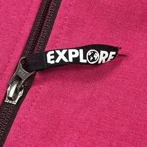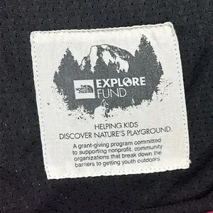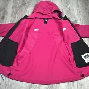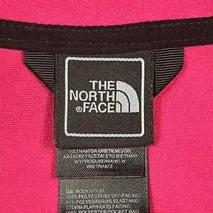 The North Face Soft Shell Jacket in pink and black with silver embroidered logos. Teamed with Explore Fund - Helping kids discover nature. Small stain on the sleeve but still in great pre-owned condition. Measurements in the pictures