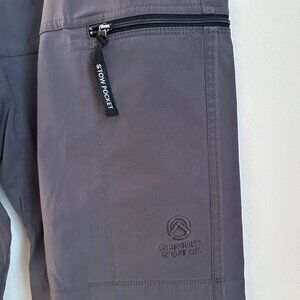 Stow pockets - 4 zip pockets on front - 2 zip pockets on back - 11.5" zip on back at the bottom of the pants Exterior shell 92% nylon 8% spandex - high performance - dry quickly - resist wrinkling - packable - fast drying. Lining 85% nylon - 15% spandex