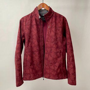 Amazing spring softshell jacket in a gorgeous deep maroon with a tone-on-tone organic pattern and a lightweight maroon fleece lining. Three zippered pockets, and drawstring waist. Slightly fitted shape is so flattering. So stretchy and comfortable, you'll reach for this one again and again.