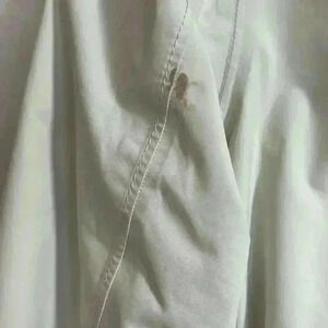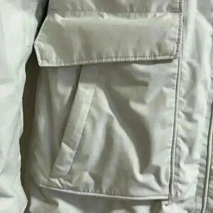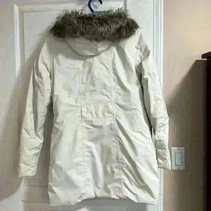 The North Face women's white parka, fur hood, zip/ button closure and pockets, small. Has small markings pictured on back of left arm barely noticeable.insulated with goose down