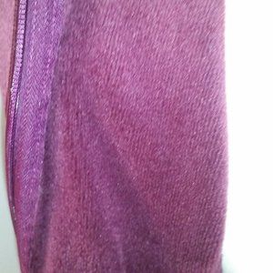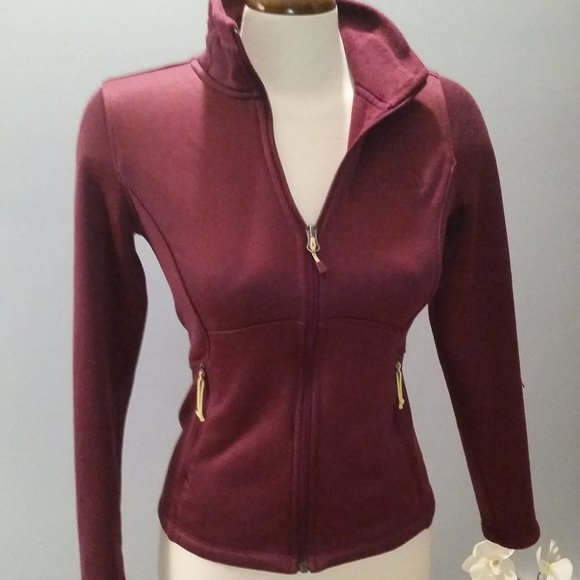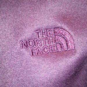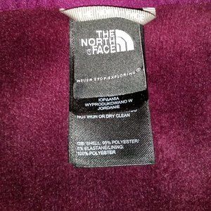 The North Face plum coloured fleece lined jacket. Neon green zipper tabs. Please see last picture, Sight snag repaired on sleeve. Very good pre-loved condition.
