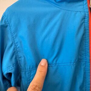 Cute bright blue reversible jacket with striped orange fleece lining. Features a cozy hood, durable zipper and zippered pockets. Embroidered logo on both sides. Perfect for fall days!