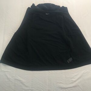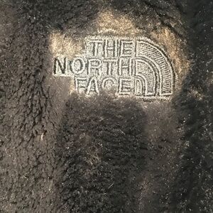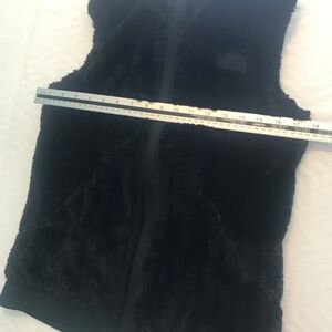 Super soft North Face hooded vest, faux fur in black. Front pockets with zips and pulls. Jersey lining with trim at waist.