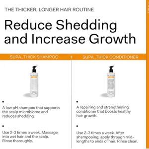 Shampoo powered by science. SUPA_THICK SHAMPOO is a gently foaming, low pH shampoo designed to support hair growth and density. Free from silicones, parabens, SLS and artificial fragrance, it deeply cleanses hair and scalp to remove build up while reducing shedding, strengthening strands and rebalancing the scalp microbiome. The result: all-round healthy hair from root to tip.
