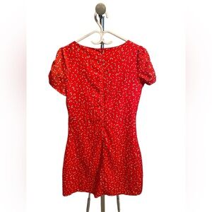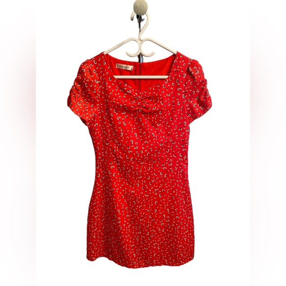 Fashion printed mini dress. Short sleeve with pleated detailing under bust and by waist. Red liner on inside, zipper closure on backside of dress. No pockets, no stretch. Gently used, in good condition.