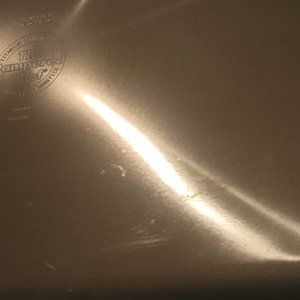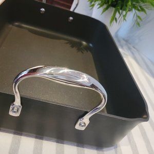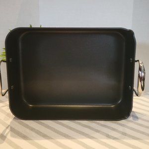 The Pampered Chef, EUC, retired roasting tray, (no rack) Hard anodized non-stick titanium with 2 corner pour spouts. Features DuPont non-stick coating. Large enough for 20lb turkey, or 2 whole chickens, large roasts, ribs or lasagna. From oven to stovetop to make homemade gravy. Very minor scuffs per pic. Heavy duty tray. Does not include the bag as shown in last pic. For demonstration only. 12 x 16 or 30 x 40 cms. In almost new condition!!