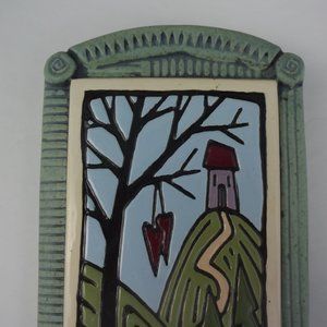 Measures 8 inches high, 3 & 1/2 inches wide, and 1 inch thick. Has hole on back for hanging.