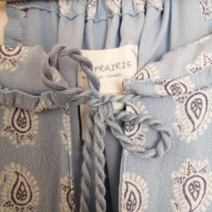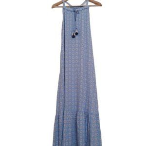 The Prairie by Rachel Ashwell blue and white strapless maxi dress. Tassels to tie up in the front. There is like a teardrop feather design throughout the dress. Side pockets.
