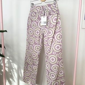 Bold purple and white circular pattern. High-waisted fit. Unique and stylish design.