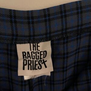 The Ragged Priest blue and black trousers. These pants are high-waisted and wide legged with silver hardware. These feature a wide rolled hem, and silver chain at the waist.