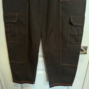 Super sick baggy Y2K-style cargo pants from The Ragged Priest in black with orange contrast stitching (very Halloween!). Pants have silver hardware detailing with the exposed front zipper and D-ring detail. Material is 65% polyester, 35% viscose. These pants are a mall goth dream 🖤