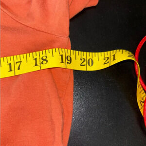 This orange rust cropped pullover top features a V-neck with tie front detail and ruffled long sleeves. The colour in the full pictures is darker than the actual shirt which is the colour in the other photos.