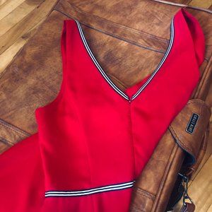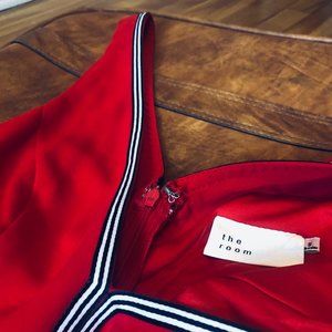 The Room red jumpsuit, wide leg but snug fit around waist. Beautiful cleavage in the front and in the back.
