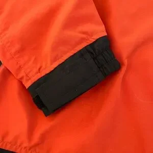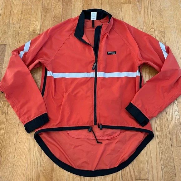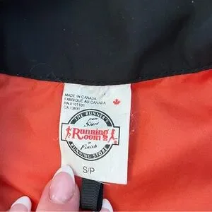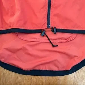 The Running Room Orange/Red Jacket. Features cinching hem, under arm zippers and a clip pouch on the back. Very good quality jacket!