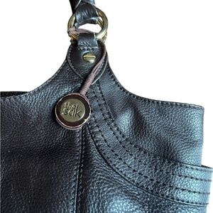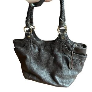 Gorgeous leather larger "Bellagio" tote hobo bag made by The Sak! Made with soft pebbled leather. Decorative stitching, tall exterior side pockets, rolled leather braided handles and silver toned hardware. A zipper at the top opens to a fully lined interior with interior pockets. 16" across top tapers to about 11" across the base. 11" top to bottom at center and 5" deep.