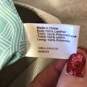 100% Leather; Trim: 100% Polyurethane; Strap: 100% Cotton; Lining 100% Polyester