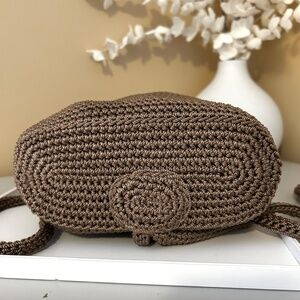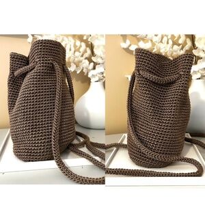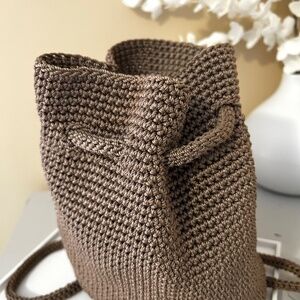 Sustainable, functional, and stylish… all in this cute mini backpack by The Sak. The neutral taupe makes it perfect for all seasons and travel. Sizes are approx 9.5”Tall, 9”Wide, and3”Deep. Bucket style drawstring handles pull in top to about 4”Wide when empty. Made from The Sak’s signature “Tightweave” sustainable crochet and lined with recycled nylon lining. Made in Indonesia. Open centre with one zippered inside pocket. Original price US$89. In pristine like new condition.