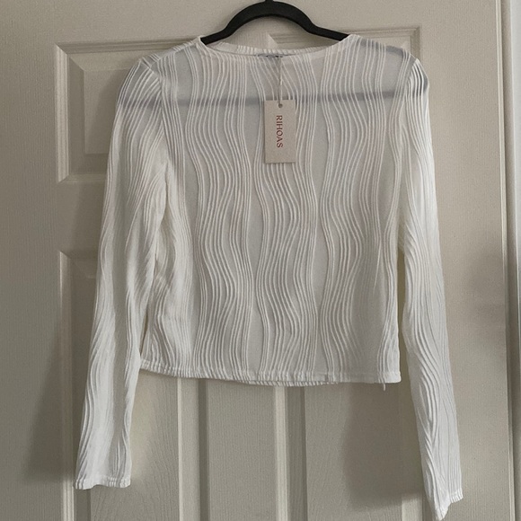 Never worn, true to size. Note it’s a short top but not crop. Also will need an undershirt underneath because it’s a little see through.