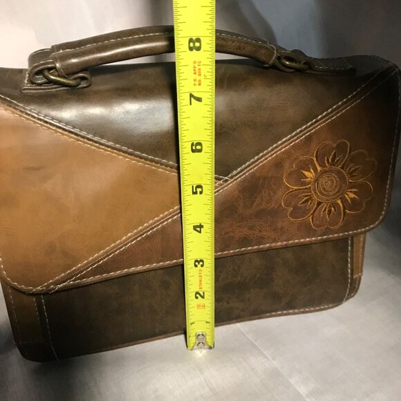 The Stone Bag Top Handle Embroidered Flower Brown Faux Leather 10x7.5"