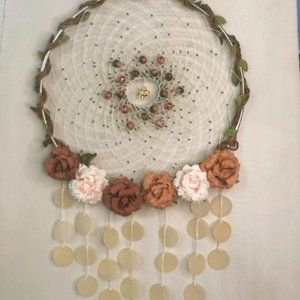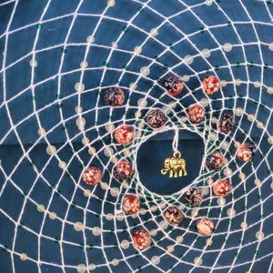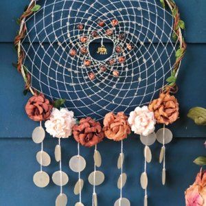 Each part of the wall hanging has meanings tied to the physical world. One notable meaning is the stefánia has a round shape that represents the earth’s physical shape. The webs, depending on what herbs, talisman's or intents the piece is created with, can encourage good luck, good health, fertility, good crops harvests, symbolize joy and longevity, to ward off evil spirits, encourage psychic dreams, promote sleep, to celebrate victory for returning heroes, to aid memory, ward of death, placed on coffins to ensure safe passage to the underworld often spoken of as the dreamscape, to calm the soul and absorb terrible dreams at night discharging them during the day. The beaded and often sea-shelled adornments elaborately decorate the hanging to enhance its power.