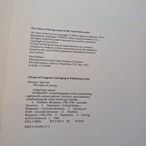 The Value Of Saving. The Story Of Benjamin Franklin is a Part of The ValueTale Series Vintage Hardcover Books. By Spencer Johnson, M.D. Published in 1978 by Value Communications, Inc.